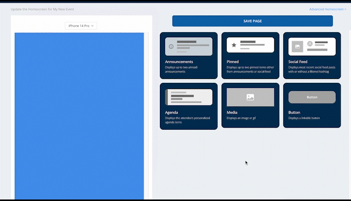 I want my Home Screen to display Announcements, the meeting Agenda, and a Button linked to a page to connect donations for my event. So, I'll click and drag each of those elements on to the Home Screen. When I'm done, I'll have a full-feeling Home Screen!