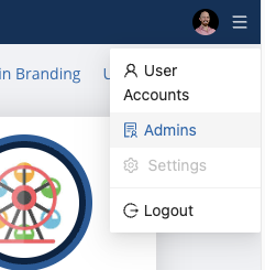 (If you can't see the "Admins" option, your window may be sized too small. Either enlarge your browser window, or click on the menu button to the right of your Profile image:)